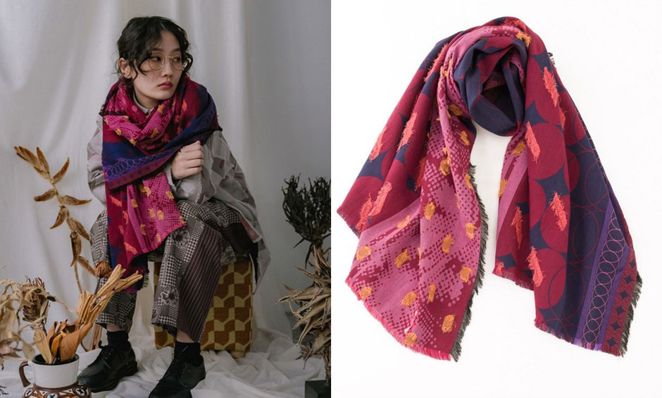 タテ糸とヨコ糸の重なりが生む色の奥行きと、カットされたヨコ糸による立体テクスチャがPOLSらしい一枚。 ご家庭での洗濯やアイロンも可能で、日常使いにも◎ ブルー・レッド・グレイの三色展開で、冬のスタイリングに彩りを添えてくれます。