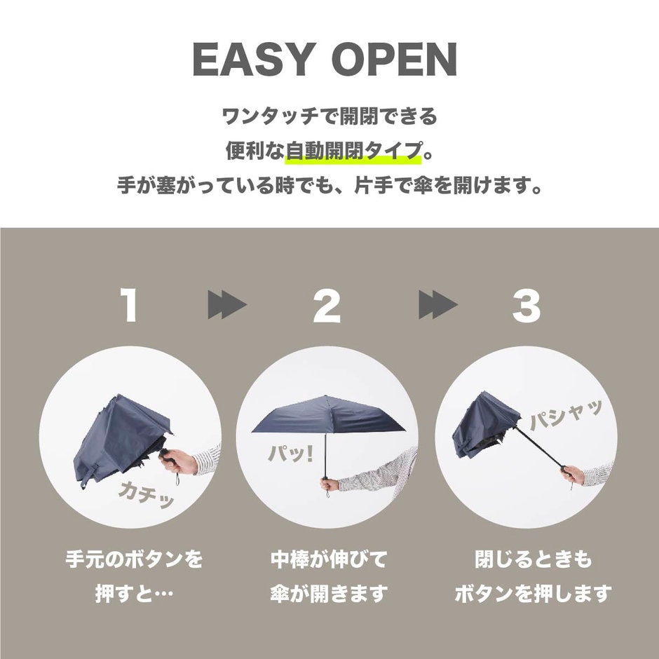 ボタンひとつで開閉ができるため、片手が塞がっていてもストレスなく使用できます。