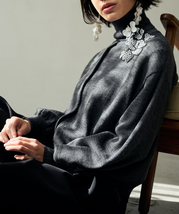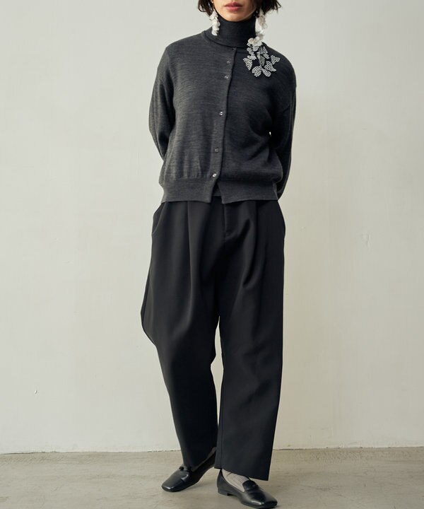 カーディガンとタートルネックは2サイズ展開で、このスタイリングではサイズ「02」を着ています。