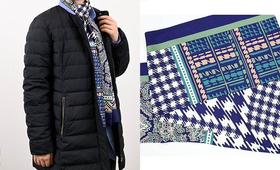 こちらのスカーフはネイビーを基調にした多彩な柄が特徴で、プレーンなダウンジャケットに個性的なアクセントを加えています。長めのデザインで巻き方次第で表情が変わり、コーディネートに動きと深みをプラスしてくれます。