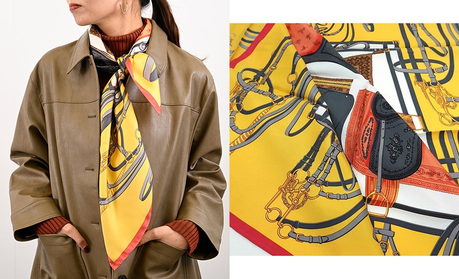 鮮やかなイエローが目を引き、シンプルなレザーコートに明るさと華やかさをプラスしています。大きめの柄とツヤ感のあるシルク素材が大人っぽく上品な雰囲気を演出するのもポイントです。