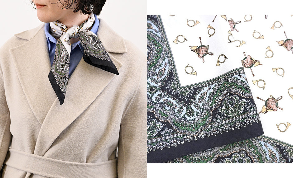 繊細なペイズリー柄が特徴で、クラシカルなコートスタイルにさりげない華やかさを添えています。落ち着いたカラーリングとシルクの上品な質感が、大人のこなれ感を演出してくれます。