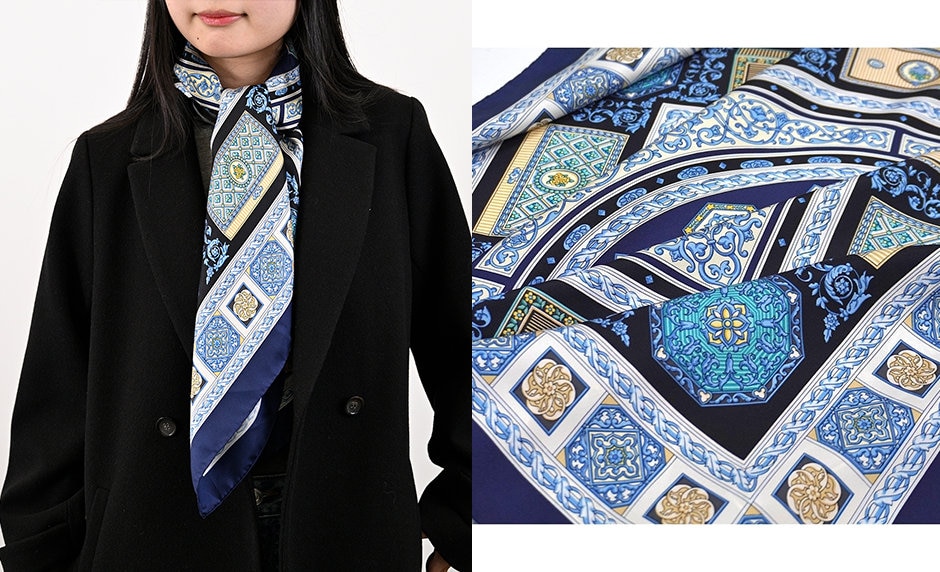 鮮やかなブルーとゴールドの柄が印象的なスカーフが顔周りを華やかに彩っています。上品なシルク素材の光沢感と繊細なデザインが、シンプルなコートスタイルに洗練されたアクセントを加えています。