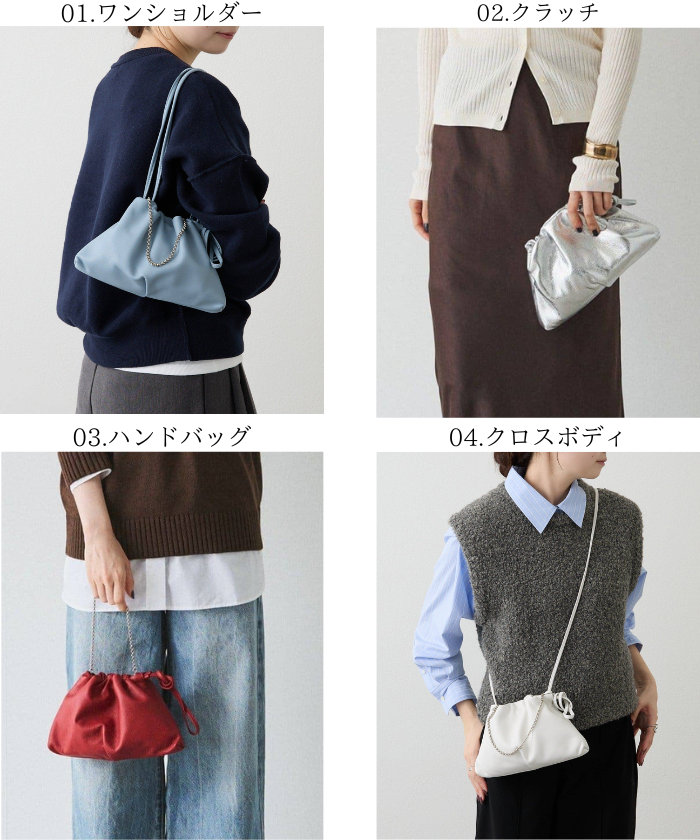 4通りの持ちかたで楽しめる機能はそのままに、華やかなチェーンベルトをプラスしました。