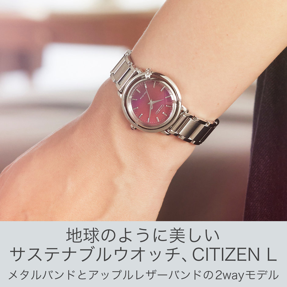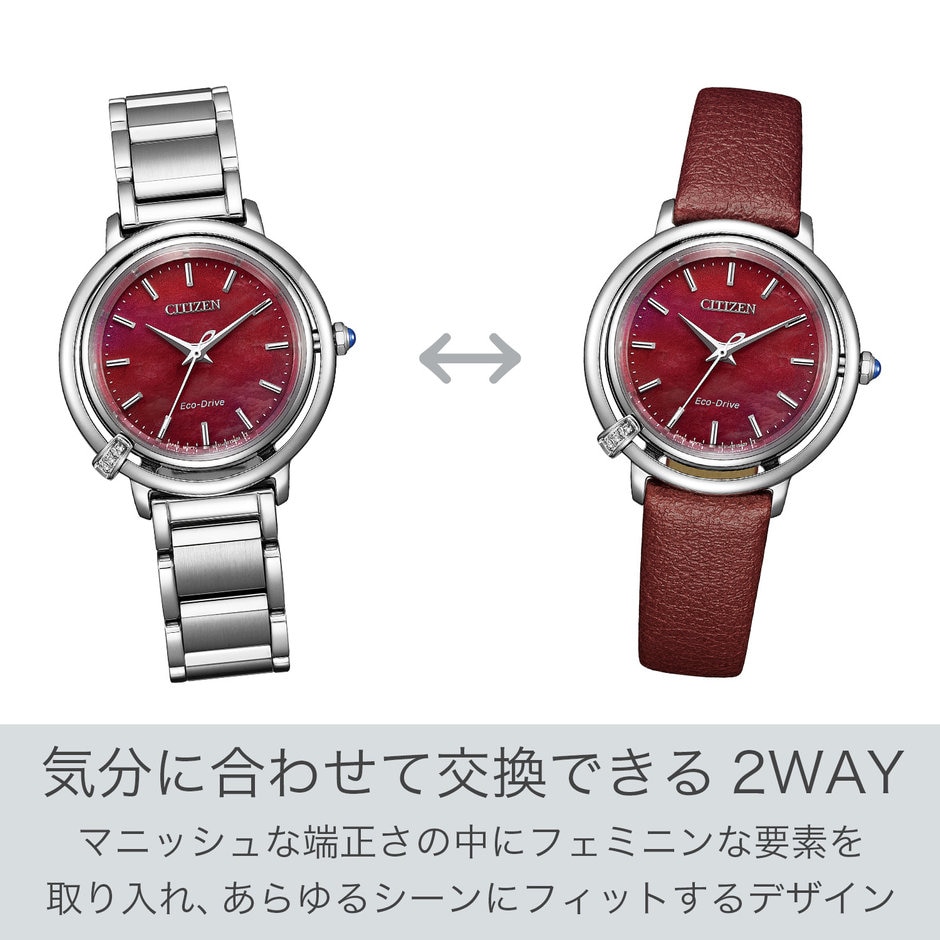 光の放射を表現したインデックスと切分で視認性が高く、マニッシュな端正さの中にフェミニンな要素を取り入れ、あらゆるシーンやファッションにフィットするデザインです。メタルバンドと植物由来(リンゴ)のバンドは、スムーズに付け替えが可能なインターチェンジャブル構造を採用。その日の気分やシーンに合わせて2wayスタイルが楽しめます。