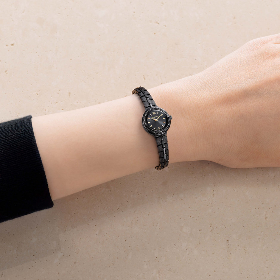 ころんとした小ぶりなラウンドケースに、時刻が見やすいシンプルでかわいらしいデザイン。文字板を彩るゴールドのインデックスや針は、漆黒の夜空に輝く星をイメージしたデザインです。ベゼルのデザインモチーフは、人との結びつき・良縁を願う「紐」。紐には「ほどけることのない、結び付ける」という意味から、「人と人との結びつき・絆・あらゆる物事に対して良縁がもたらされますように」という願いが込められています。