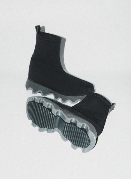 ブラック一色でまとめたミニマルなデザインながら、波打つような曲線美を描くアウトソールが程よく個性をプラス。