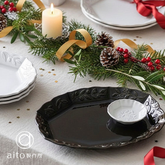 クラシカルなフォルムにオリーヴのレリーフをあしらった上品な器が、日々の料理をほどよく引き立て、どんなテーブルにもすっと馴染む存在です。