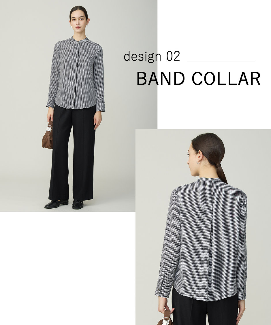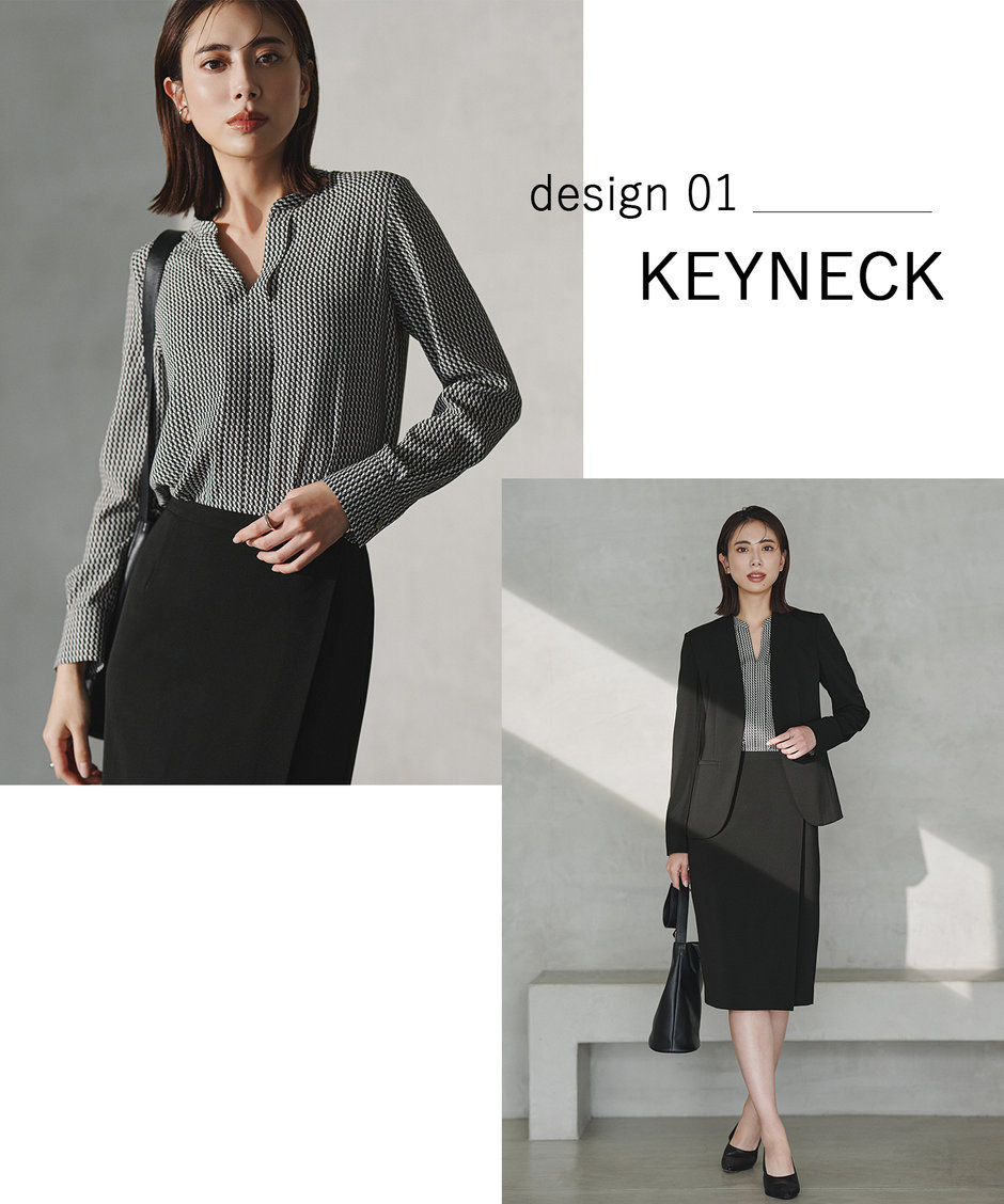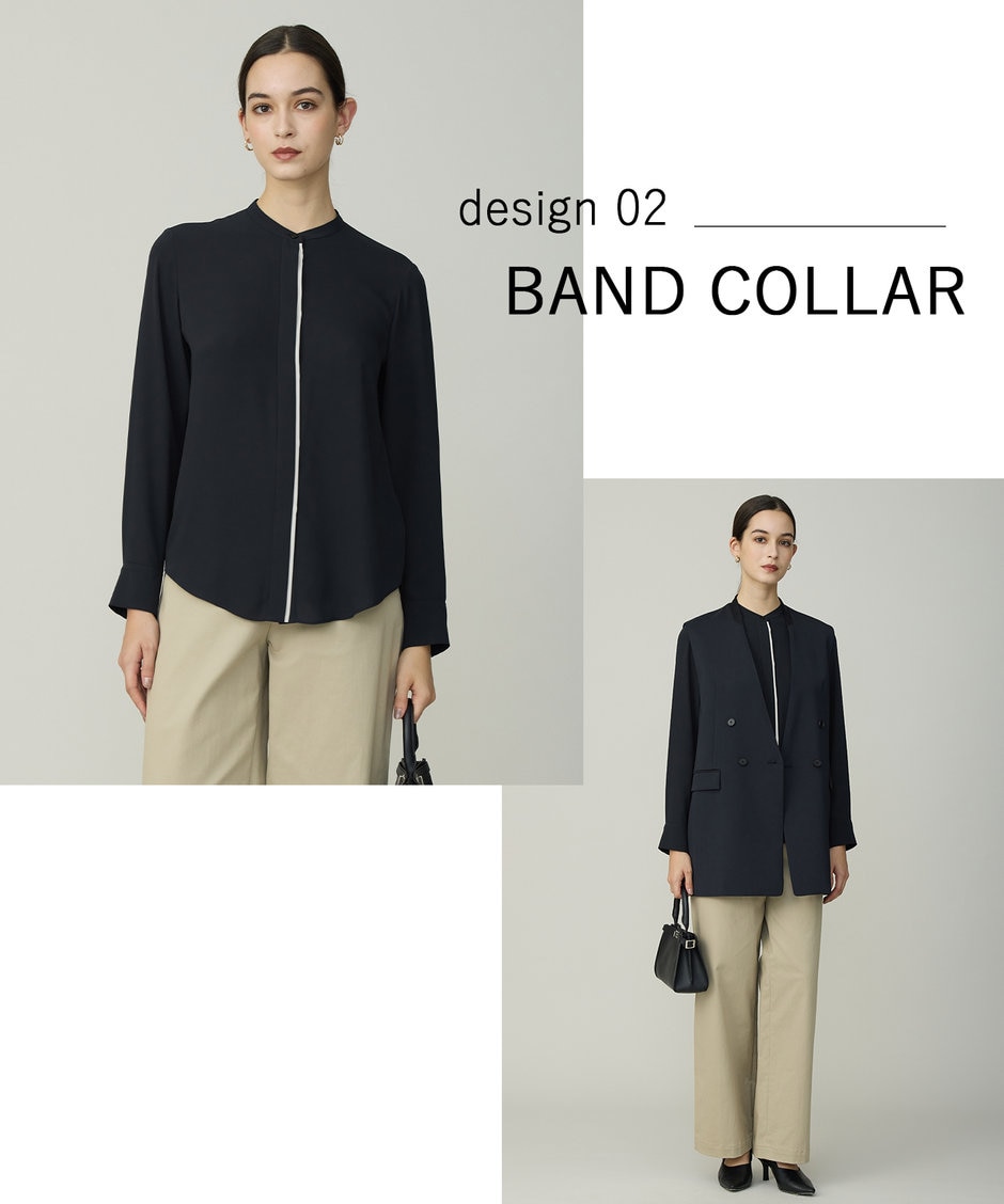 定番のバンドカラーデザインをはじめ、キーネックやボウタイ、長袖・五分袖、、と1年中ご愛用いただける豊富なデザイン展開も名品ブラウスならでは。