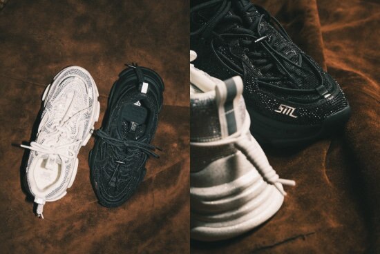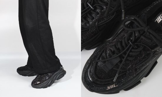 アッパー全体に細かなラインストーンを贅沢に散りばめ、動くたびにきらめくデザインが特徴。