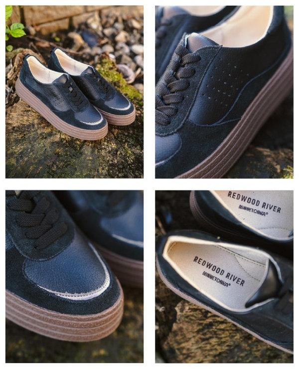 トレンド感のあるデザインに、MINNETONKAの個性を表現する素材のコントラストと、ステッチワークを施したハイブリッドモデル。