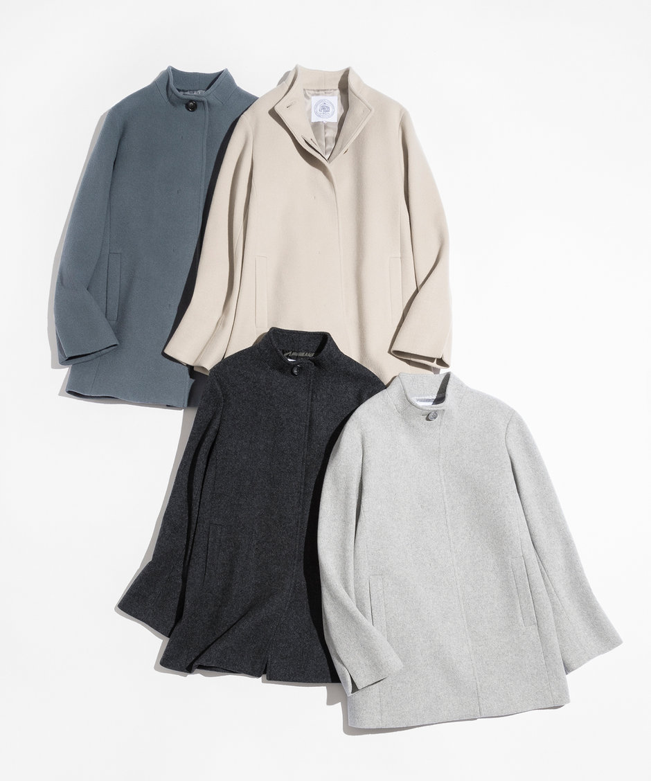 端正な印象のスタンドカラーコート。高すぎない襟元が印象を和らげてくれる、現代のキャリアウーマンにふさわしいデザイン。ボタンが表に出ない比翼仕様も、スマートさの秘密。