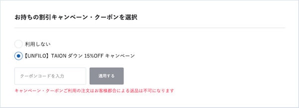 3. お持ちの割引キャンペーン・クーポンの選択欄の【UNFILO】TAIONダウン15%OFFキャンペーンを選択し、適用するをクリック。