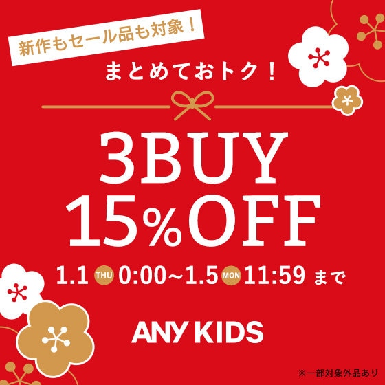 本日から1/5(月)11:59まで、ANY KIDSにて3BUY 15%OFFキャンペーンを開催中!