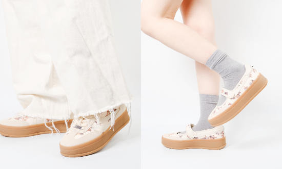 淡い色合いの花柄が足元にやさしいアクセントを添え、コーディネートをぐっと新鮮に見せてくれます。