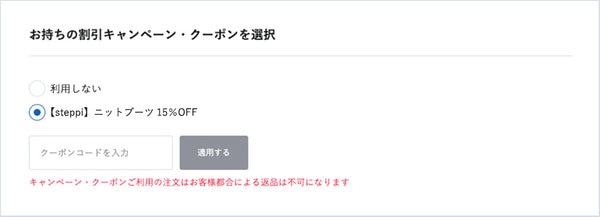 3. お持ちの割引キャンペーン・クーポンの選択欄の【steppi】ニットブーツ15%OFF を選択し、適用するをクリック。