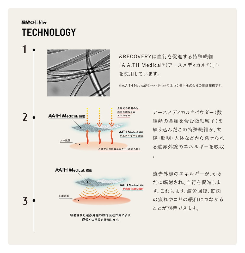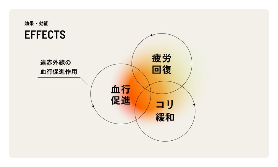 からだの遠赤外線エネルギーを輻射して血行促進する特殊繊維を使用し、暮らしに取り入れやすいようにデザイン。
