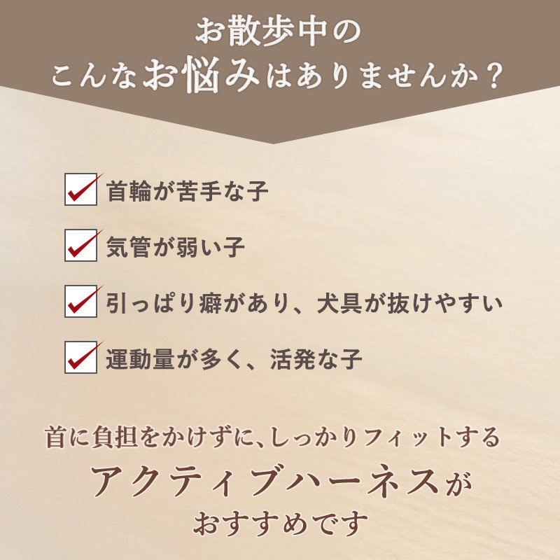 首に負担をかけずに、しっかりフィットするアクティブハーネス。