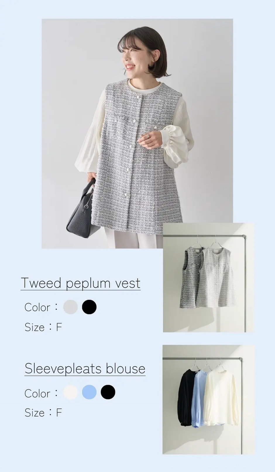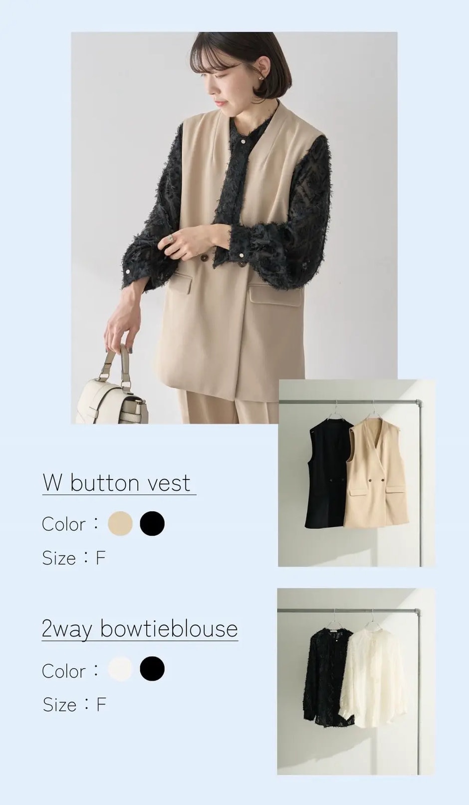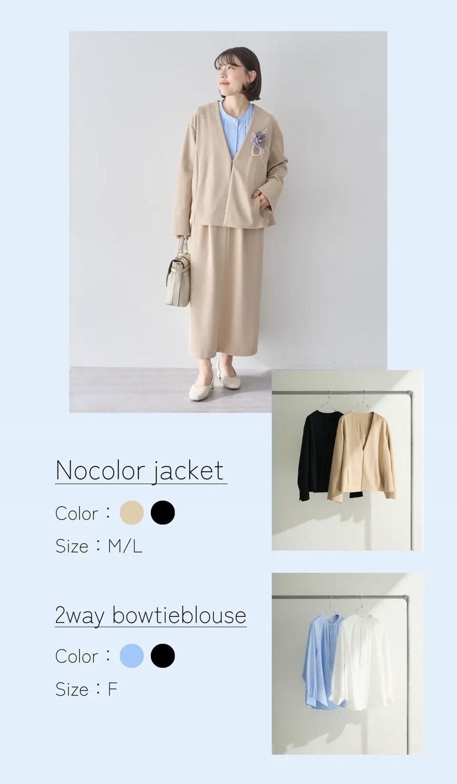 春らしいベージュに、ブルーを合わせる事で爽やかさとメリハリ感を演出。入園、入学式におすすめのスタイリングです。