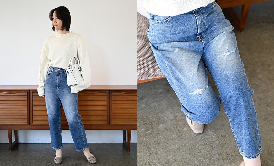 次は上記と同型でダメージデザインありのアンクルデニムです。程よいダメージ加工がこなれた雰囲気を演出し、カジュアルスタイルにアクセントをプラスします。ストレッチ性のある素材で動きやすく、快適な履き心地を実現。ミッドブルーの色合いが鮮やかで、幅広いシーンで活躍する一着です。