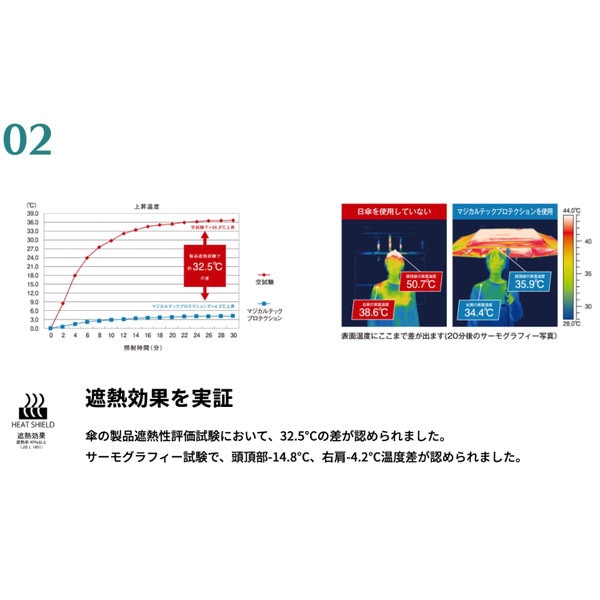 傘の製品遮熱性評価試験において、32.5℃の差が認められ、