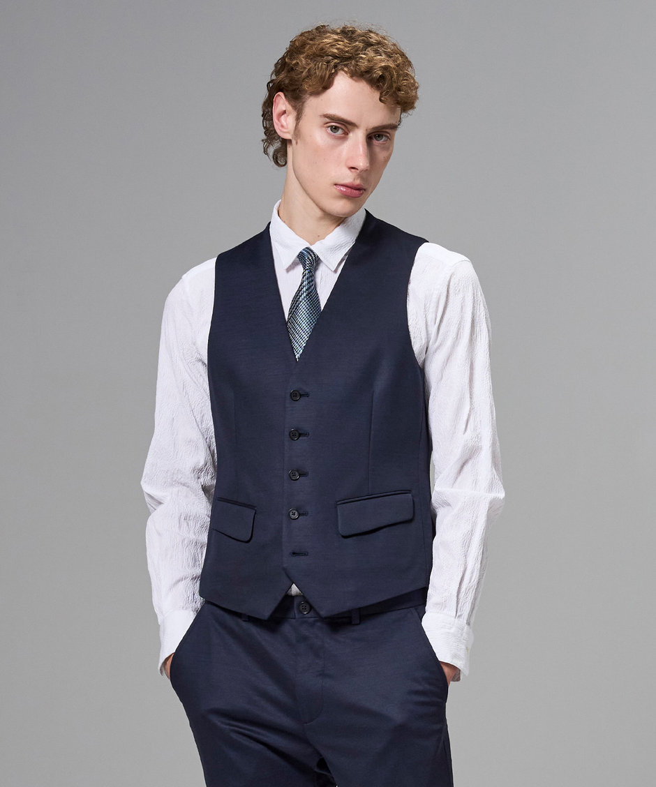 ジャケットインを前提に設計した、すっきりとしたジレ。