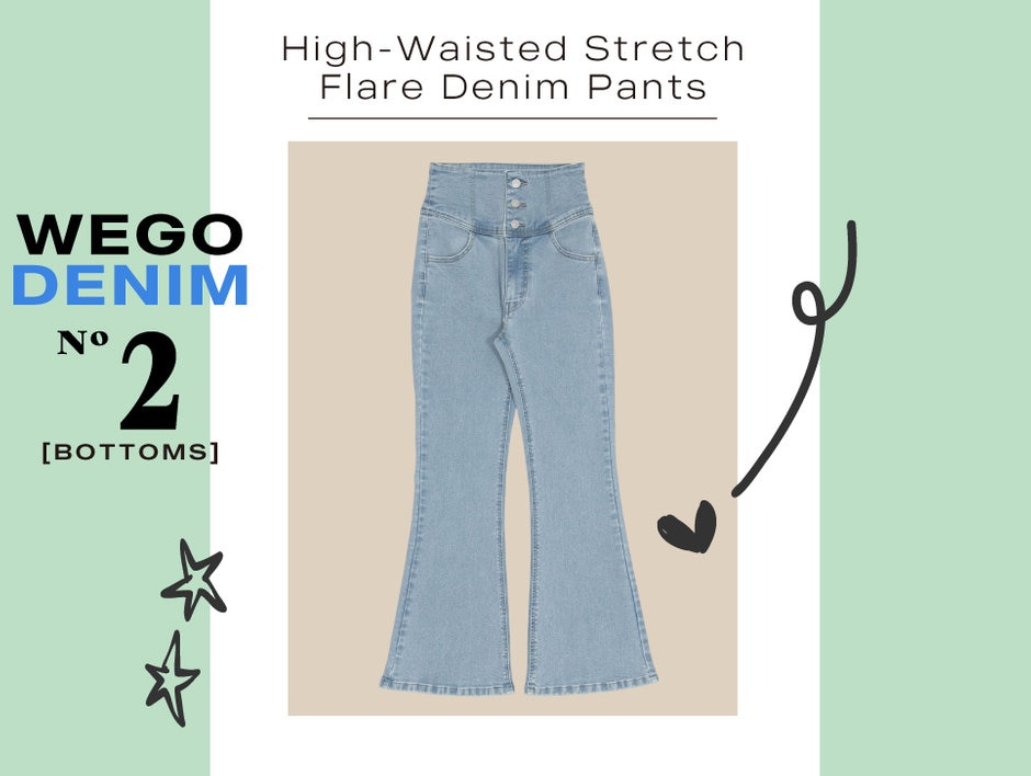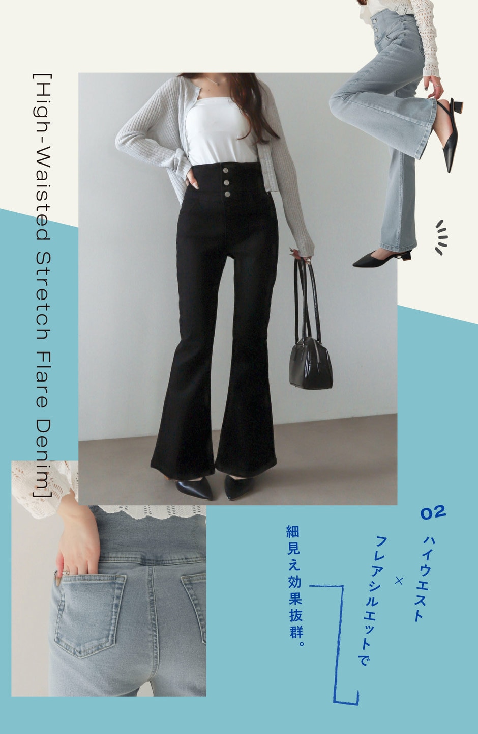 【ストレッチ/美脚/脚長シルエット/XSSMサイズ展開】ハイウエストストレッチフレアデニムパンツ
