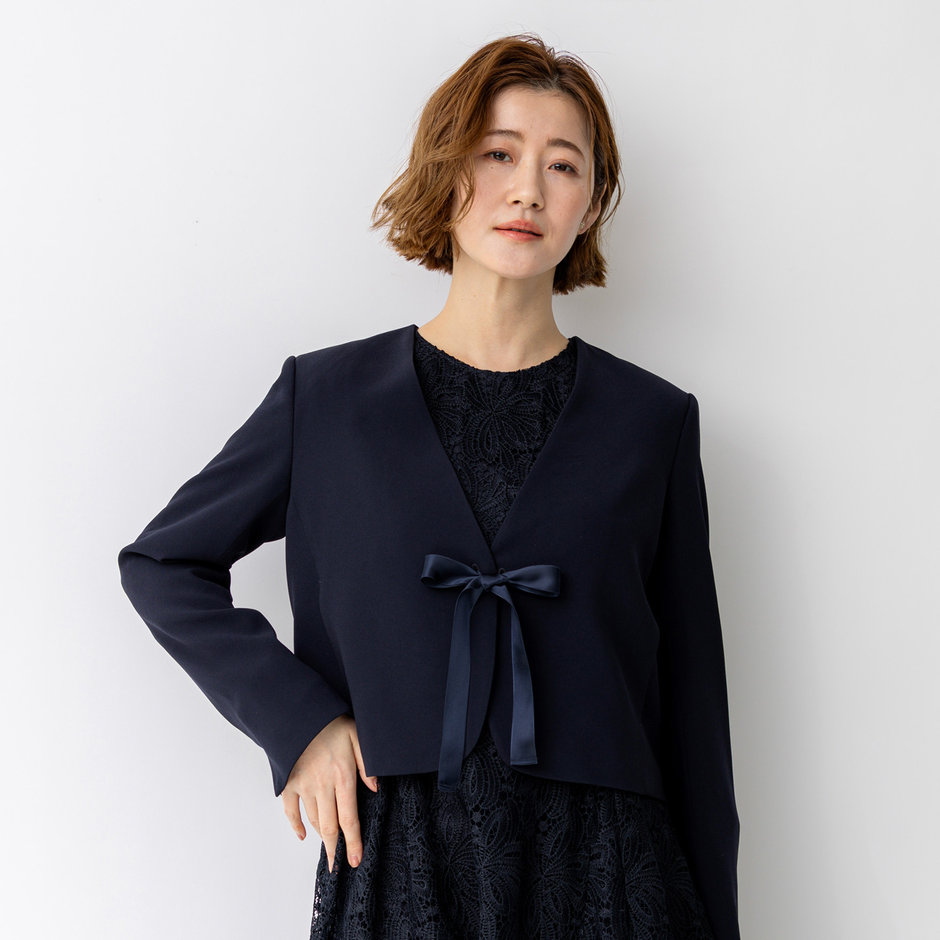 すっきりとしたシルエットのジャケット。フロントボタンを付属のリボンにすることで華やかさをプラス。