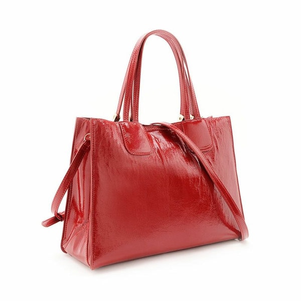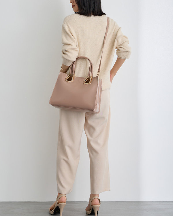 艶やかなエナメル素材が、品よく洗練された印象を演出するハンドバッグ。