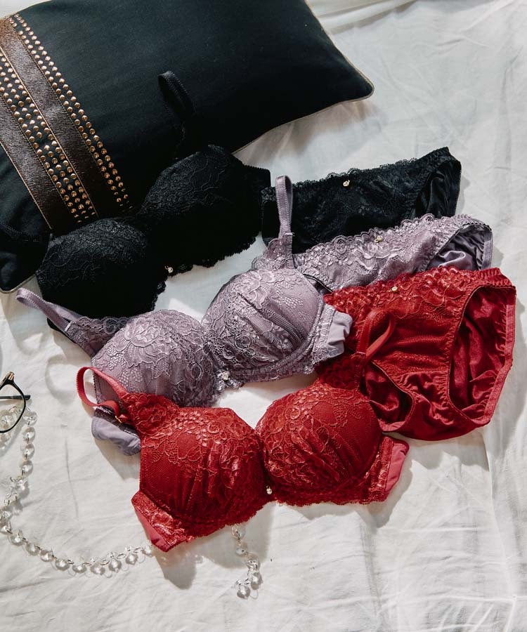 ストレッチ素材のレースが谷間でクロスしているデザイン、ストラップを引き上げるパターンと相まって綺麗な谷間を演出します。