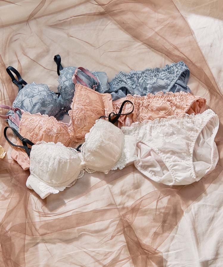 光沢のある大きな花柄のストレッチレースがバストを包み華やかな印象に…