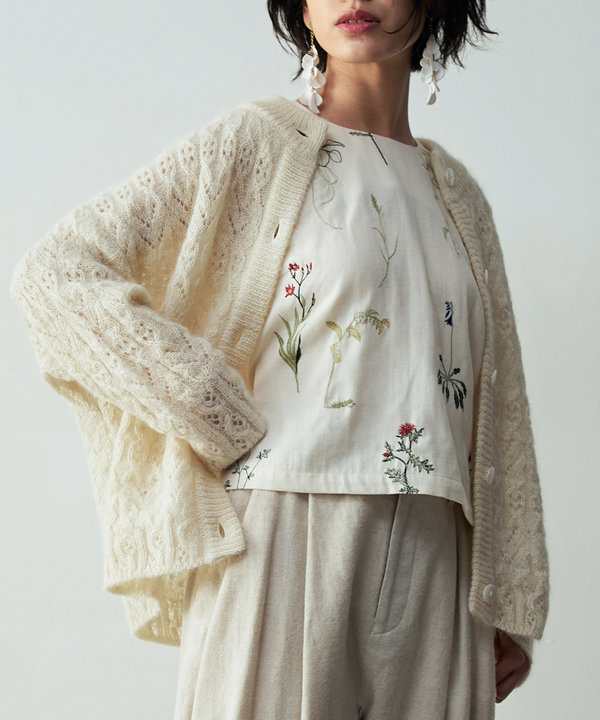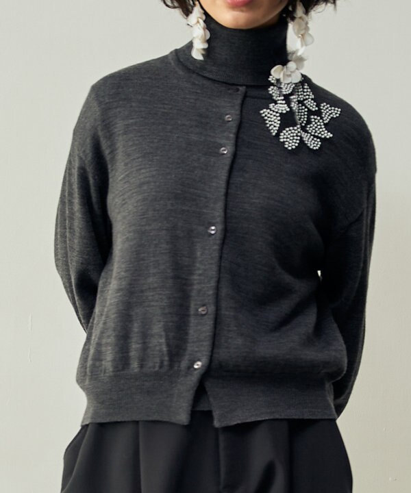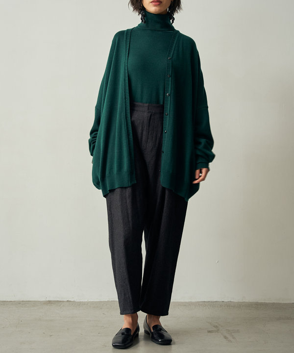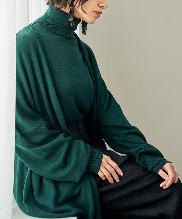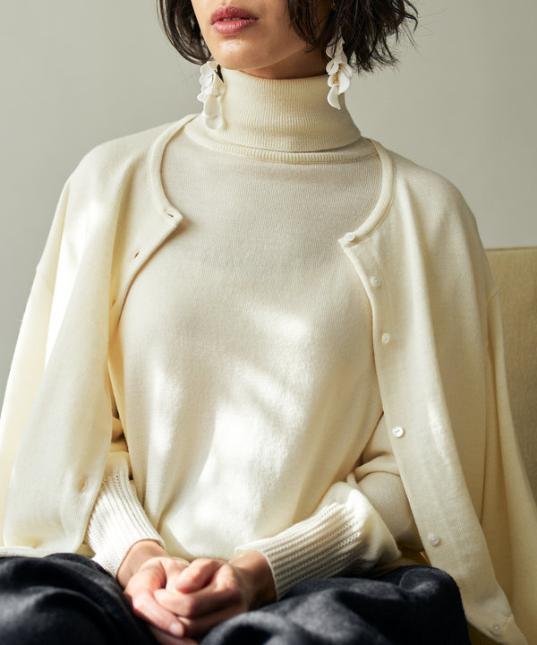薄手でかさばらないため、同素材のカーディガンと合わせたアンサンブルスタイルも。