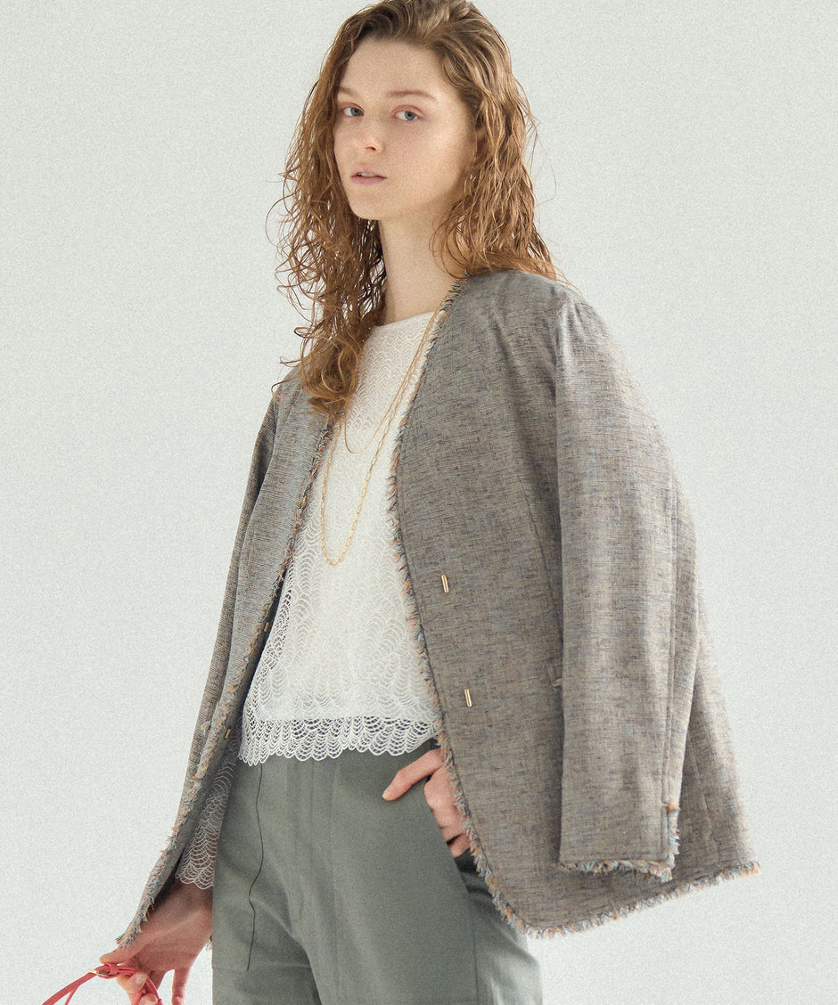 リネンライクブッチャー フリンジノーカラージャケット ¥39,930(税込)>Lサイズ >Sサイズ