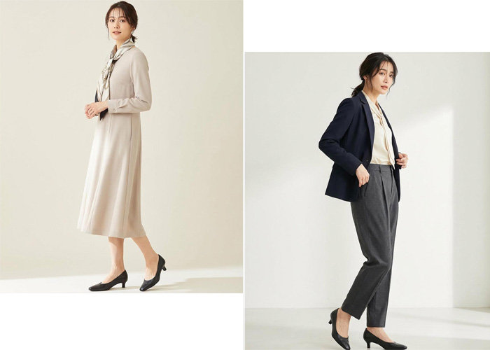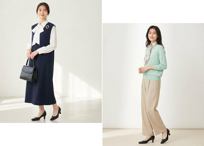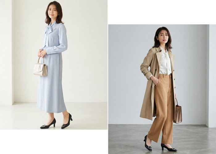どちらも黒のパンプスが足元を引き締め、女性らしさときちんと感を両立した着こなしです。