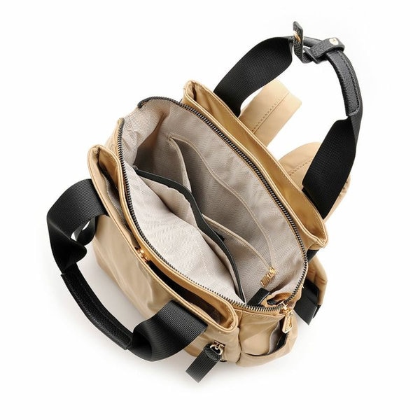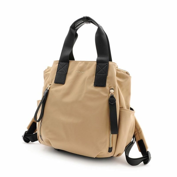 両サイドには折り畳み傘やボトルが収まるオープンポケットを、フロントサイドには縦に走るファスナーポケットを配置。