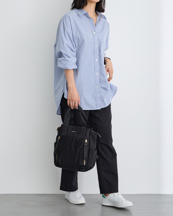 前後に配したゆとりのあるポケットと、中央のファスナー収納がスマートに区分され、見た目以上の収まりを叶える設計です。