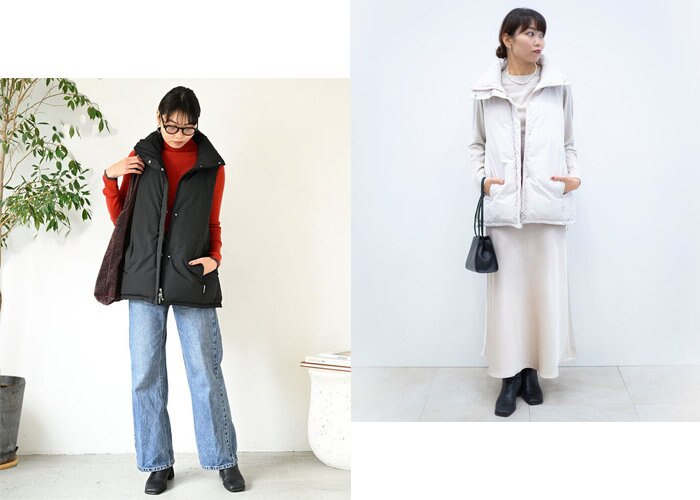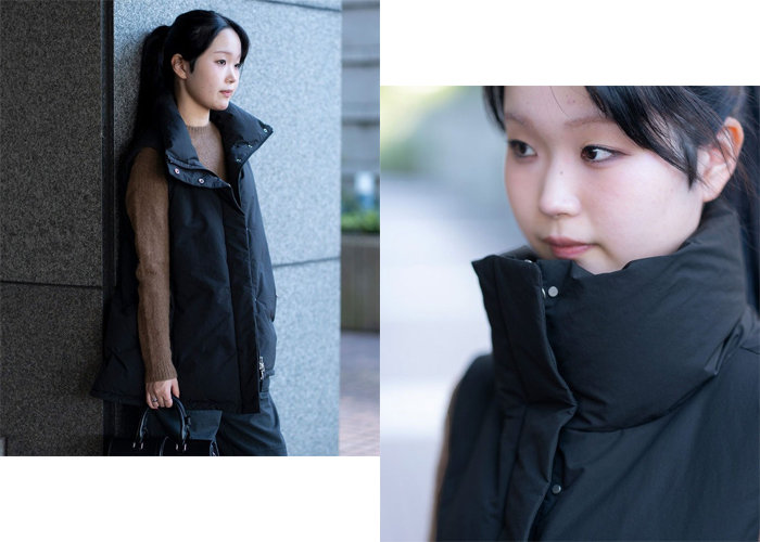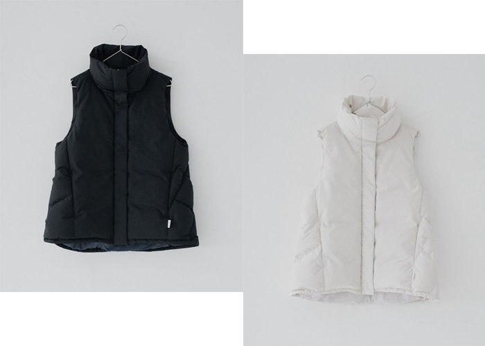 スタンドカラーが顔まわりをすっきり見せてくれるダウンベスト。
