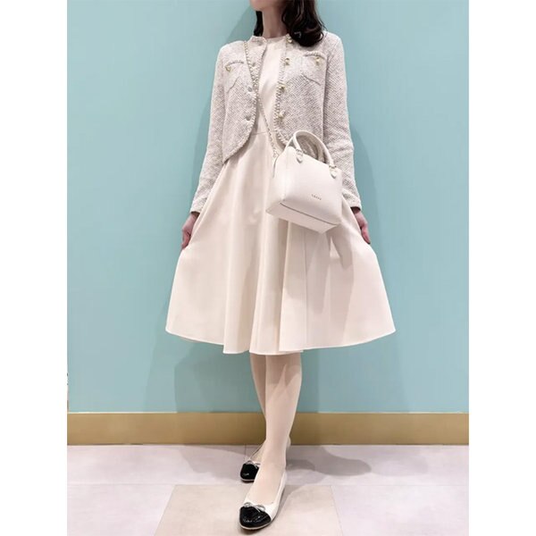 柔らかなニュアンスカラーでまとめた上品で清楚なコーデは、フォーマルなオケージョンにもぴったり。