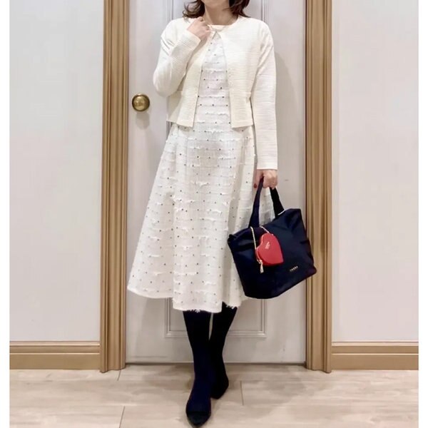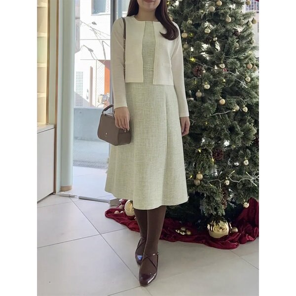 コンパクトですっきり見えするツイード風ニットジャケットを合わせた、新春にもセレモニーにも活躍する上品スタイル。