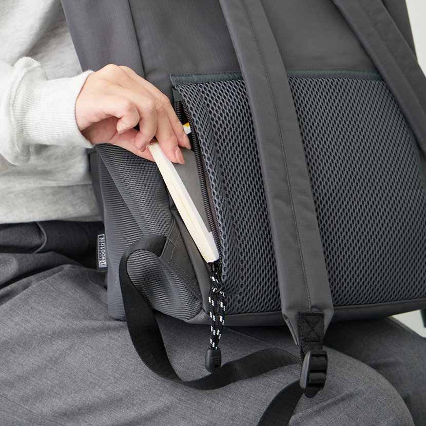 両サイドにあるメッシュルーポケット&マチと被せのあるフロントポケット