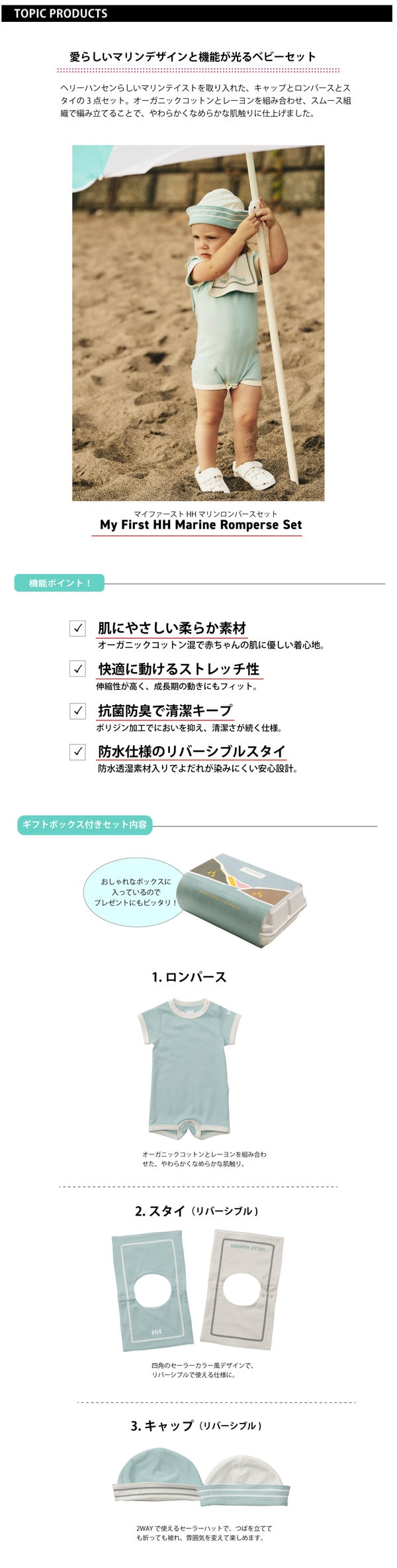 柔らか素材と安心機能がうれしい、海風を感じるベビー用3点セット