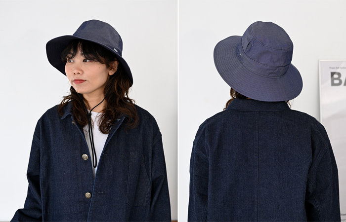 インディゴ染めのストライプ生地を使い、洗いをかけて風合いを引き出したハンチング。