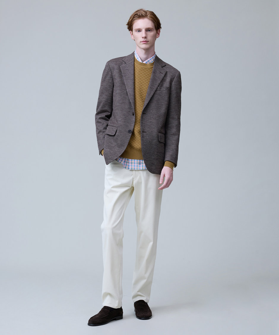 ジャケットやアウターのインナーにニットを合わせるだけで、見た目にも着心地にもあたたかみが加わります。