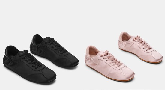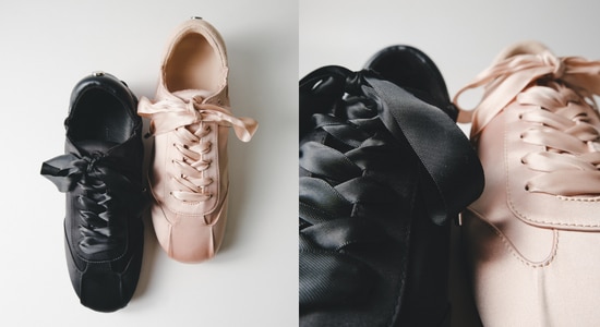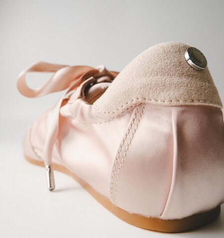 しなやかなサテン素材のスニーカーにバレエシューズのようなフェミニンさをプラスした、