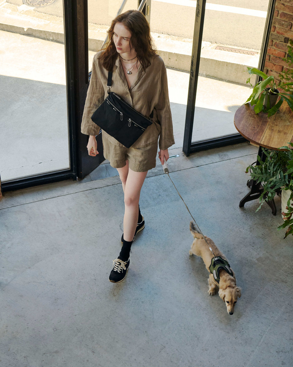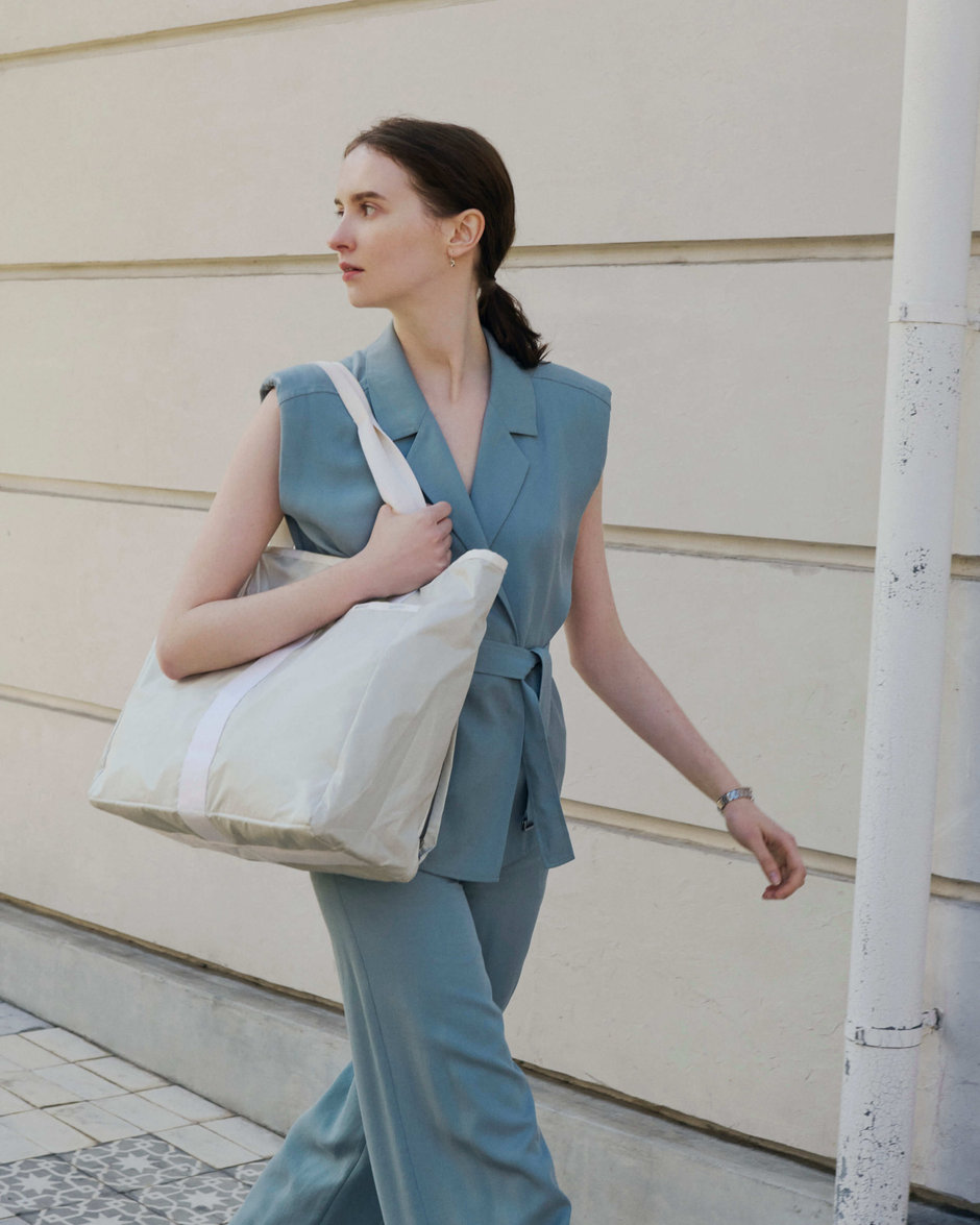 超軽量でありながら高級感のある日本製生地を採用し、毎日のコーディネートに自然に馴染むミニマルな佇まいに。
