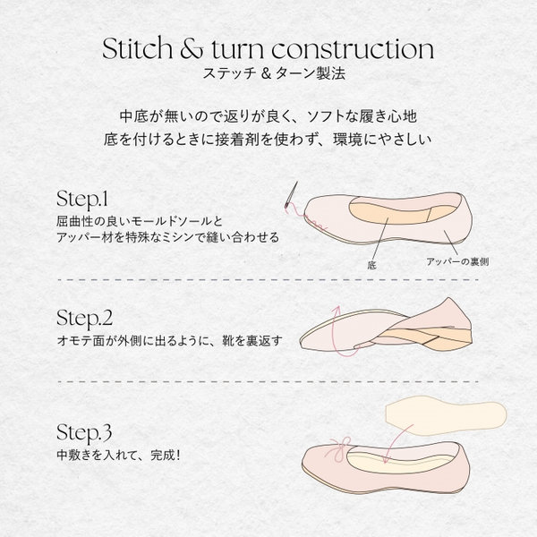 「やわらかな履き心地の秘密。ステッチ&ターン製法」