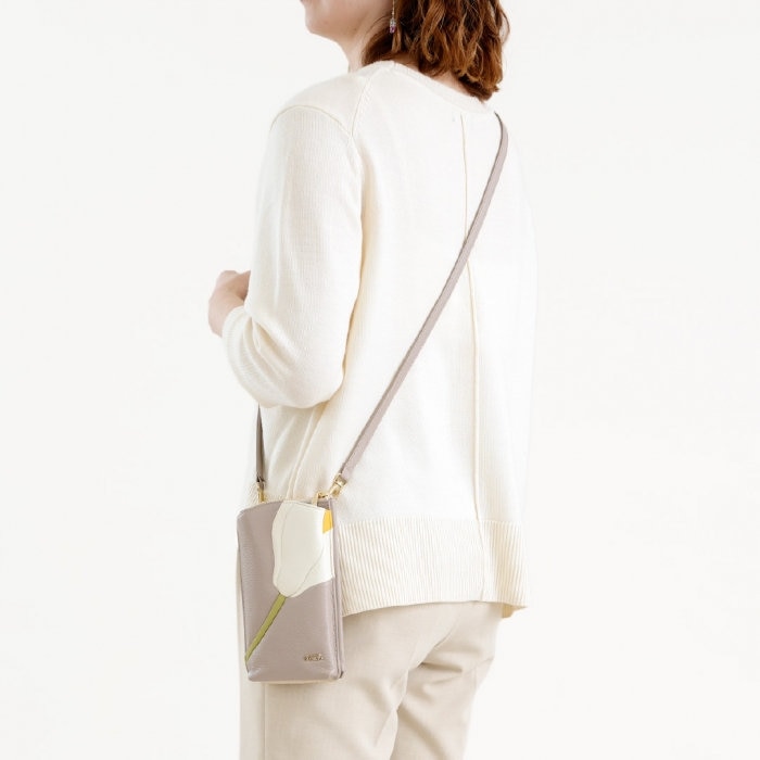 シリーズの中でもおすすめなのが、花のカットワークを装いの一部として楽しめるお財布ポシェット。