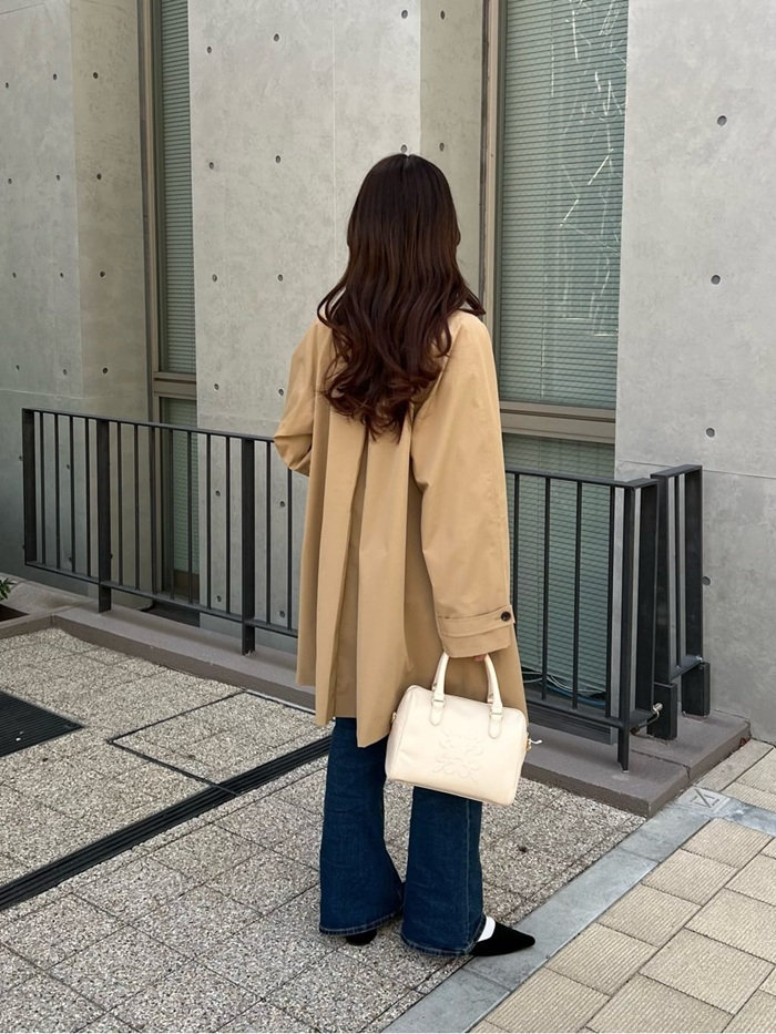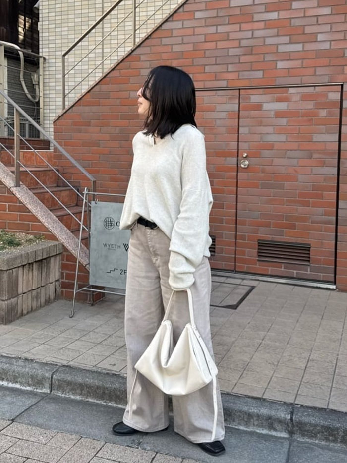 ベージュやホワイトのワントーンコーデに合わせれば、上品で洗練された印象に。
