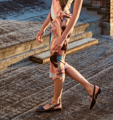 モードなエッセンスをさりげなく取り入れられる、スリングバックフラットパンプス。
