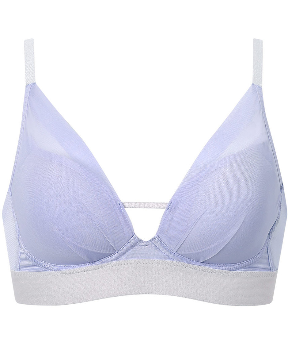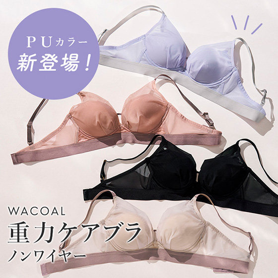 「重力ケアブラ ノンワイヤー」のシンプルタイプ。しっかりホールド感があるのに、解放感のあるラクなつけごこちが魅力です。モールドカップが自然なまるみをメイクし、機能性と使いやすさを兼ね備えています。アンダーのゴムを太めにすることで下着っぽさを感じさせないカジュアルな印象に。透け感のあるパワーネットを使用し、トレンド感のあるデザインに仕上げました。カップのパワーネットはレーシィタイプと比べ低い位置に設計し、胸もとのあいたトップスからも見えにくくおすすめです。